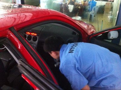 在全部工作開始前,工作人員用塑料薄膜將方向盤和儀表臺全部包好,防止因噴灑液體而損壞電器元件。