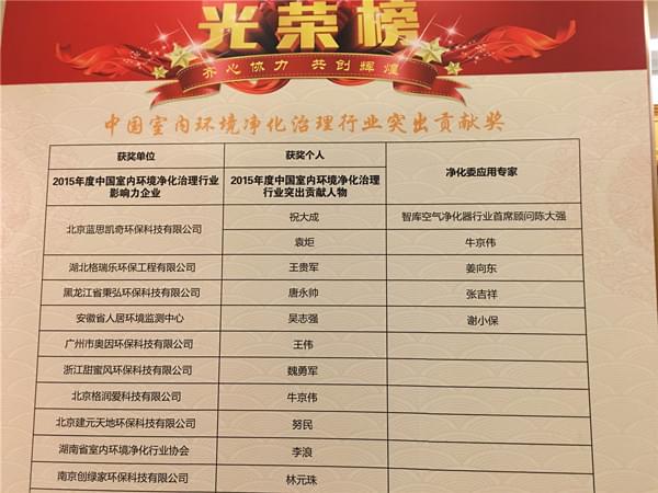 會(huì)議上,中國(guó)室內(nèi)環(huán)境凈化治理專業(yè)委員會(huì)還就2015年各企業(yè)的工作成就與貢獻(xiàn)頒發(fā)了2015年度中國(guó)室內(nèi)環(huán)境凈化治理行業(yè)突出貢獻(xiàn)獎(jiǎng),創(chuàng)綠家環(huán)??萍加邢薰精@此殊榮!